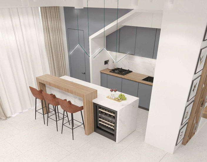 Bar/Island: A central, substantial white marble-look island anchors the space. It features an integrated wine cooler and extends into a comfortable wood bar counter area with dark, upholstered stools.