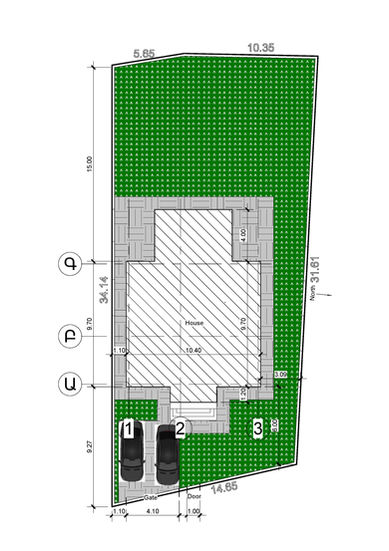 Front Facade (Image 2): The main entrance is highlighted by a wide band of vertical copper or terracotta-colored cladding. This material contrasts with the lighter-toned stone or stucco above. The entry is central, flanked by the colorful panels, and features a tall, modern door.