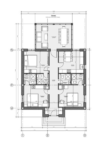 Side Facade (Image 1): This side is adapted for a steep slope. The upper floor is a dramatic, fully glazed volume with black framing, showcasing the interior space. The lower floor forms a sheltered covered terrace, supported by rough natural stone cladding walls and decorative, angled metal supports.